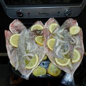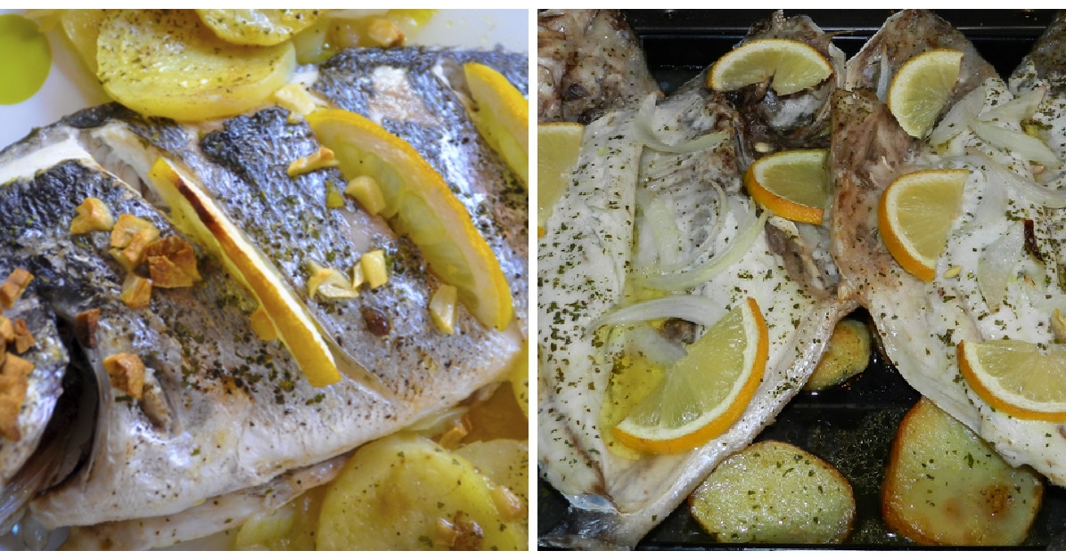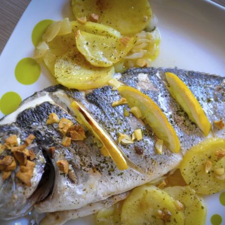 En una bandeja plana para asar se coloca la base con las patatas, se ponen encima las Doradas abiertas y se riega con un poco de aceite de oliva y el zumo de los limones. Por encima se adorna con el puerro, la cebolla y unas rodajas de limón.
