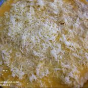 - Mientras forrar un molde bajo con la mitad de la masa, extender el relleno y cubrir este con el huevo batido y el queso rallado.