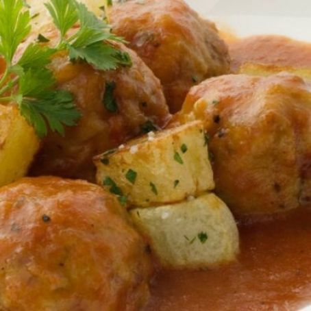 4. En una olla, vierte 200 gr de salsa de tomate. Coloca las ocho albóndigas y echa el resto de la salsa de tomate.