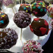 - Transcurrido este tiempo, colocar una barrita de chocolate fondant en un bol y fundirlo en el microondas, a intervalos cortos, mezclando para que no se queme, mojar la punta roma de un palillo de brocheta en el chocolate y pinchar cada bolita de bizcocho sin atravesarla.