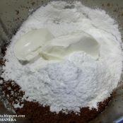 - Añadir la nata, la harina, el cacao y la sal y mezclar 4 segundos, vel 5. Terminar de envolver con la espátula.