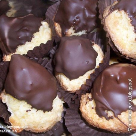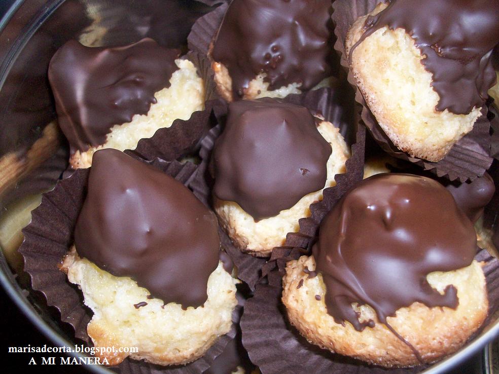 - Hornear aproximadamente durante 10 minutos, que estén doraditos, mientras derretir el chocolate en el microondas y cuando estén los coquitos bañarlos por la "cima" y dejar enfriar.