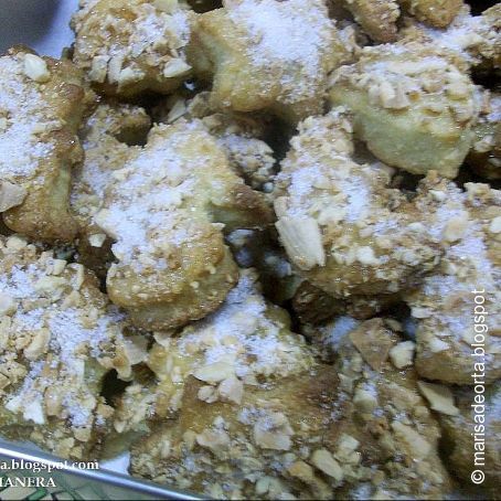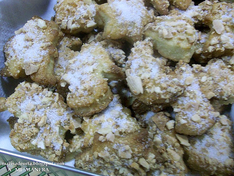 - Dejar enfriar y preparar miel caliente, picar la almendra tostada (yo la he picado con un rodillo) e ir echándola en ese orden sobre las tortas: pincelar de miel, cubrir de almendra y rociar un poquito de azúcar.