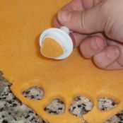 Ve cortando galletas con un cortador pequeño y poniéndolas sobre una bandeja forrada con papel de horno. No hace falta dejar mucho espacio entre las galletas ya que apenas se expanden. Re-amasa los sobrantes y sigue cortando galletas.
