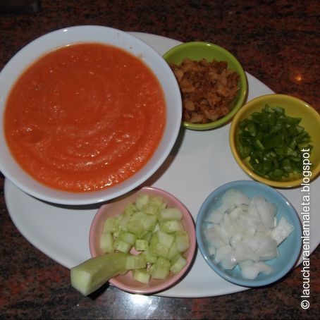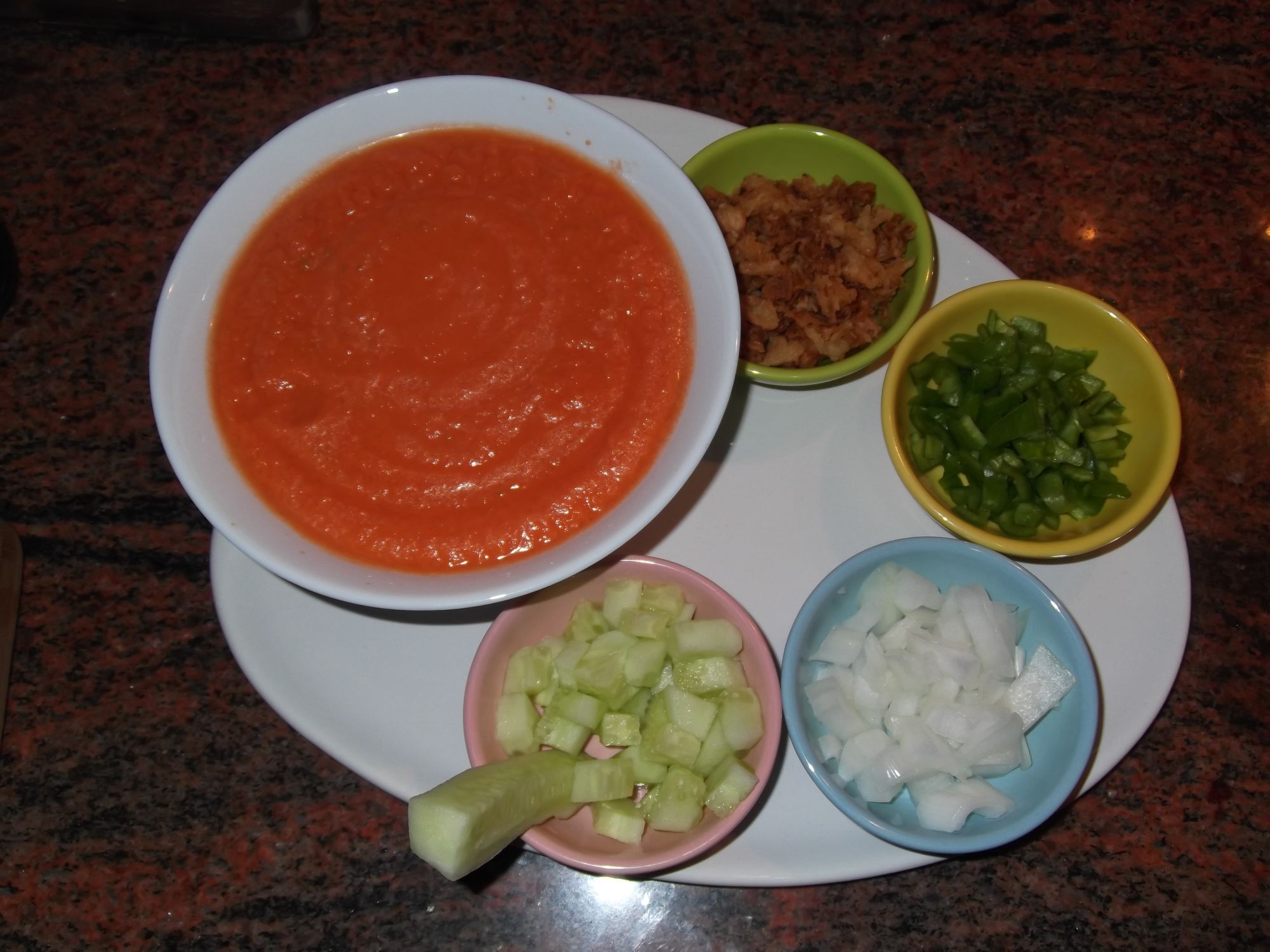 Lo metéis a la nevera y ya está listo para comer, en función del agua que tengan los tomates os queda más espeso o más líquido. No obstante, después de meterlo a la nevera siempre se os va a quedar más sólido. Además, eso va a vuestro gusto hay a gente que prefiere bebérselo y a otros comérselo con cuchara. Para estos últimos os recomiendo que pongáis alrededor de los cuencos de gazpacho cebolla frita, pan frito o más verdura para que los comensales puedan añadírselo al plato y darle un toque diferente.