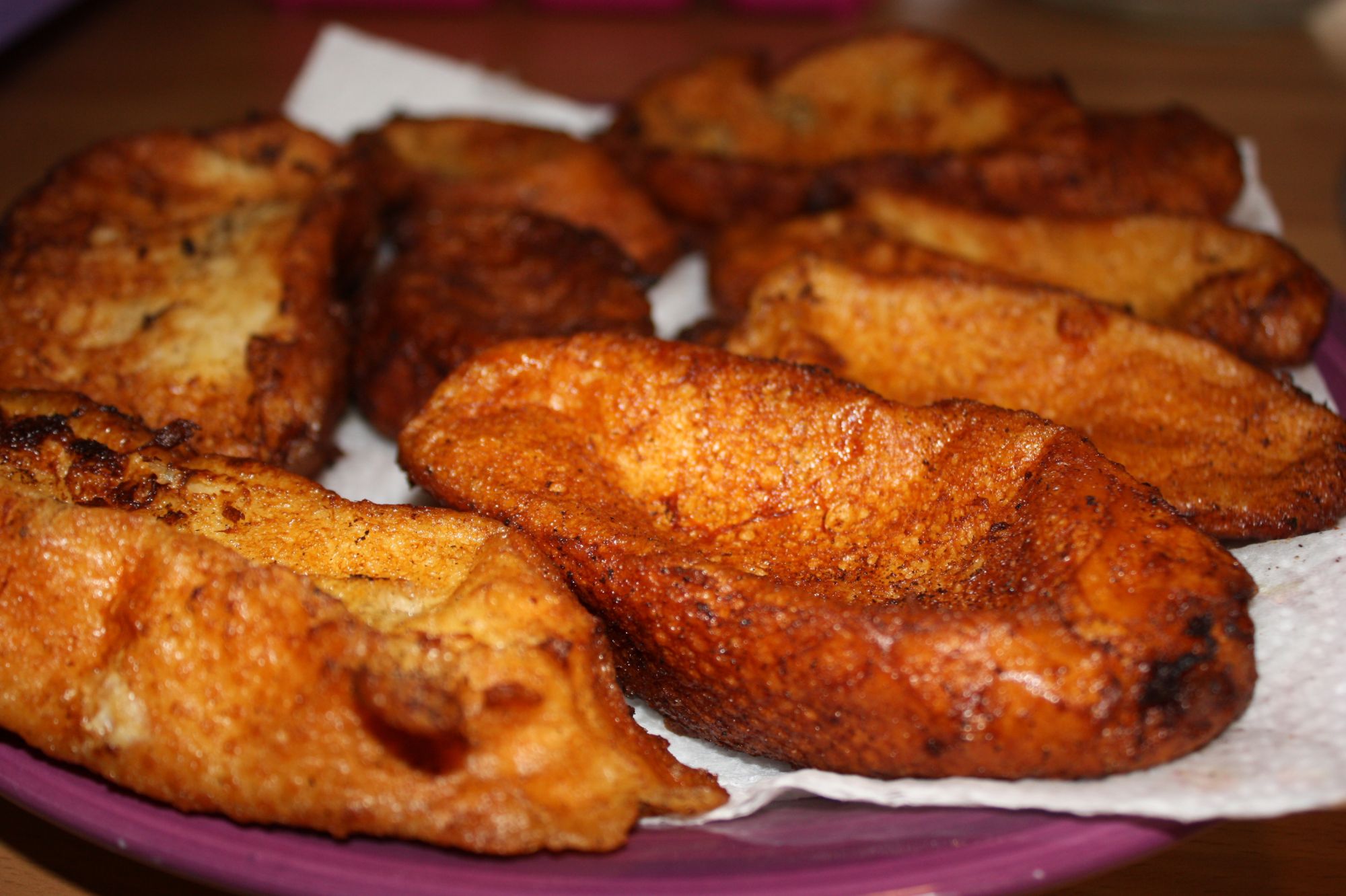 Cuando esté listo, sacamos dos rebanadas de pan y les pasamos por el huevo batido, las sacudimos un poco para que deje de gotear y las freímos en la sarten. Las sacamos en un plato preparado con papel absorbente para quitar al máximo el aceite.