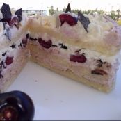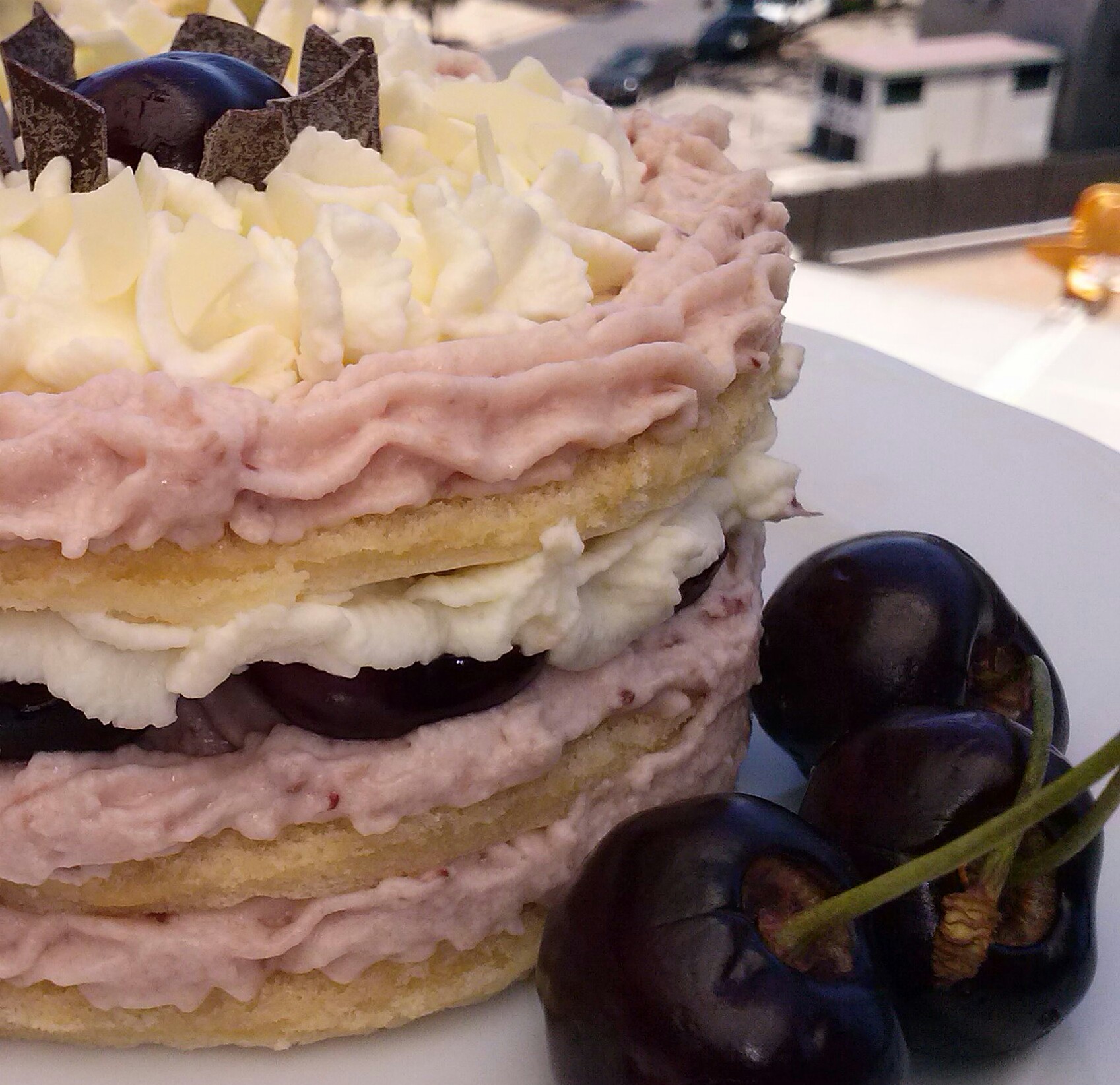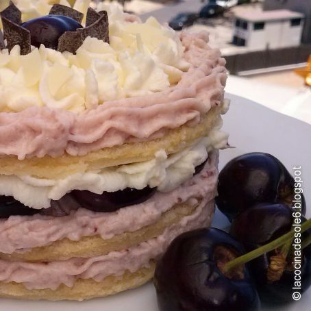 Cogemos el molde que hemos fabricado (Al final de la receta os lo explico) y dentro de él colocamos una base de bizcocho, luego crema de cerezas, el segundo bizcocho, a continuación crema de cerezas, luego cerezas cortadas por la mitad y nata montada.