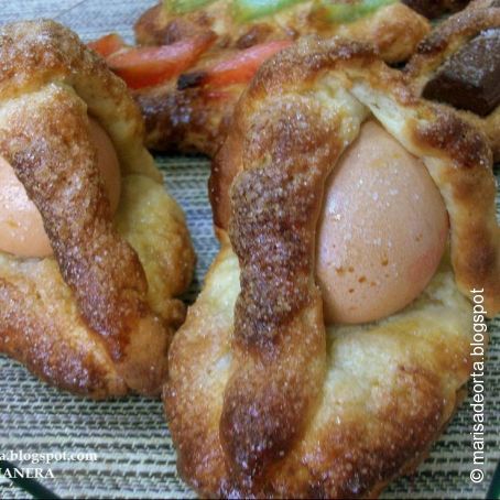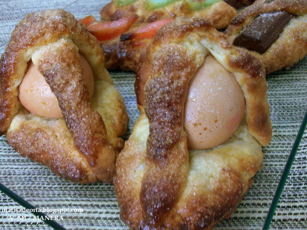 - Dar la forma a las monas, pincelar con huevo batido y colocar encima el huevo entero crudo (lavado), la fruta, el chocolate.....a gusto de cada uno y espolvorear con un poco de azúcar.