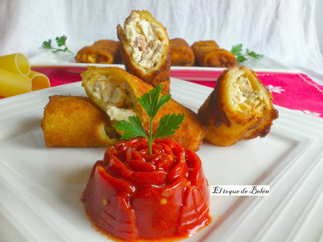 Se rellenan los tubos con una cucharita, y se rebozan en harina huevo y pan rayado y se fríen en abundante aceite caliente, se sacan en papel de cocina aunque no absorber nada de grasa.