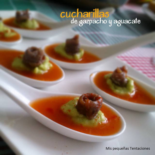 Empezamos con nuestras cucharillas poniendo en cada una unas cucharadas de gazpacho.