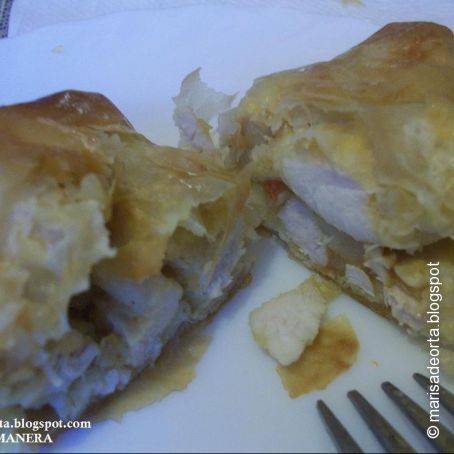- Cortar las hojas de pasta en cuatro trozos iguales, pincelar con la mantequilla y colocar un trozo de pasta sobre otro, hasta juntar cuatro y poner en el centro una cucharada de pollo dejando espacio en los extremos para que no se salga, cerrar formando paquetitos y luego juntar los extremos con más mantequilla y colocar en la bandeja del horno.