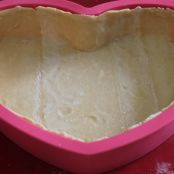 6. Para la base: Estirar un disco de masa quebrada (descongelar previamente 30 min antes) con ayuda de un rodillo. Cubrir con la masa un molde en forma de corazón previamente untado con un poco de mantequilla y espolvoreado con harina. Recortar los bordes sobrantes.