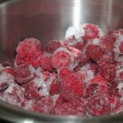 3. Para la gelatina de frambuesas (o fresas): Poner la gelatina a remojo en agua fría. En un cazo poner las frambuesas o fresas junto con el azúcar. Cocer 10 min removiendo de vez en cuando.