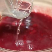 5. Calentar el agua en el microondas (con cuidado de que no hierva). Escurrir las hojas de gelatina y deshacer en el agua caliente. Incorporar el agua al líquido obtenido de tamizar las frambuesas. Mezclar.