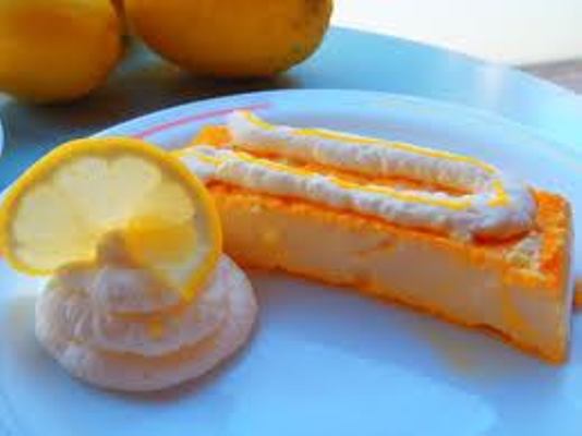 Colocamos el flan en una fuente pastelera, ponemos la nata por encima y adornamos con los gajos de limón.