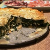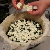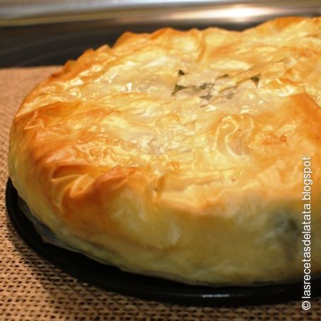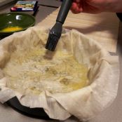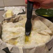 Derretimos la mantequilla. Engrasamos un molde (máx. 24 cm.) y forramos el fondo con papel sulfurizado (de horno). Con la ayuda de un pincel, engrasamos la superfície de papel para empezar a colocar las hojas de masa filo cubriendo el molde y dejando los bordes colgantes en el exterior del molde. Entre capa y capa de masa, pincelamos con la mantequilla. Hay que colocar unas 5 o 6 hojas de forma capiculada para que sobresalga masa por todo el diámetro del molde. (La masa filo la encontraréis en la zona de masas refrigeradas del supermercado).
