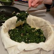 Otra capa de espinacas y doblamos las hojas colgantes cerrando la empanada y pincelando con mantequilla.