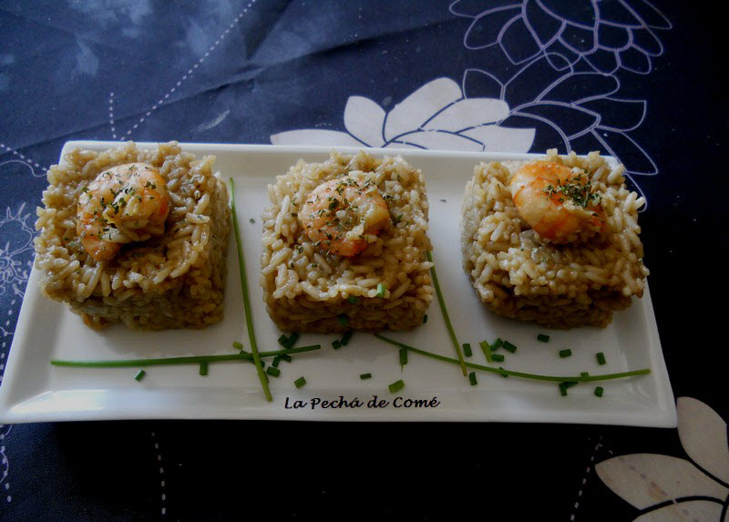 - Añadimos el arroz y 300 gr. del caldo reservado. Programamos 15 minutos, temperatura 100°, giro a la izquierda, velocidad cuchara.