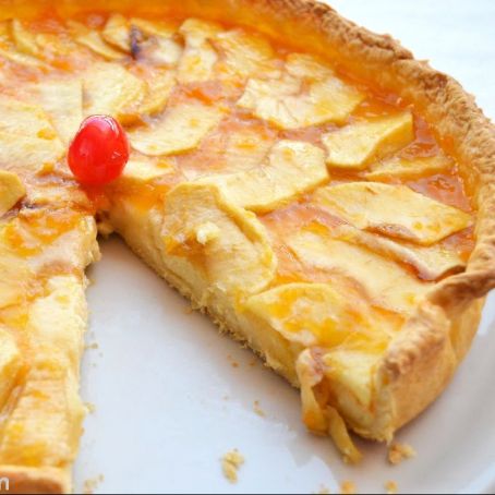 Batir bien los huevos con el azúcar, echar la nata liquida y remover. Verter en el molde y poner encima una capa de laminas de manzana. Meter al horno y pinchar para saber si esta listo. Sacar y poner por encima mermelada de melocotón y gratinar levemente.