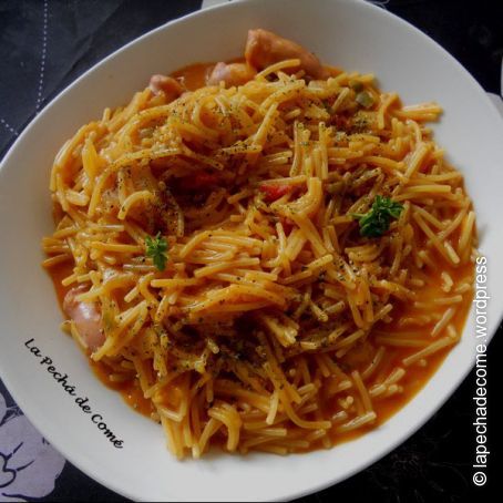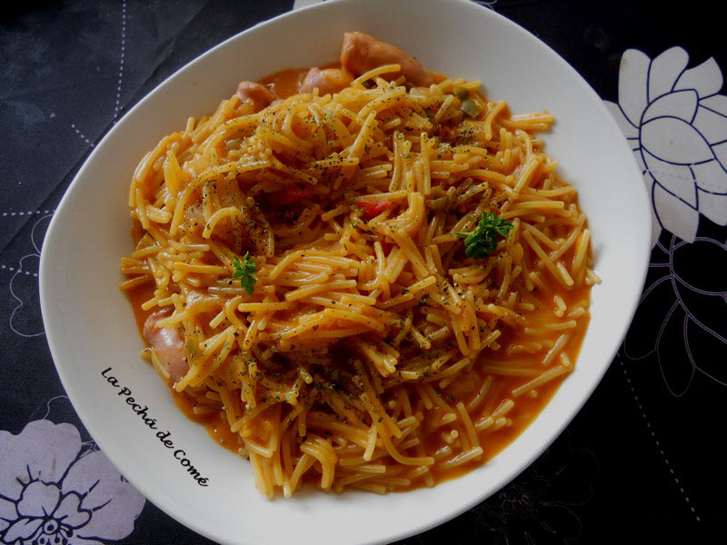 - Agregamos el pimentón, la pastilla de carne, el laurel y los fideos. Programamos 2 minutos, temperatura 100º, giro a la izquierda, velocidad cuchara.