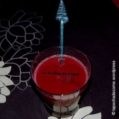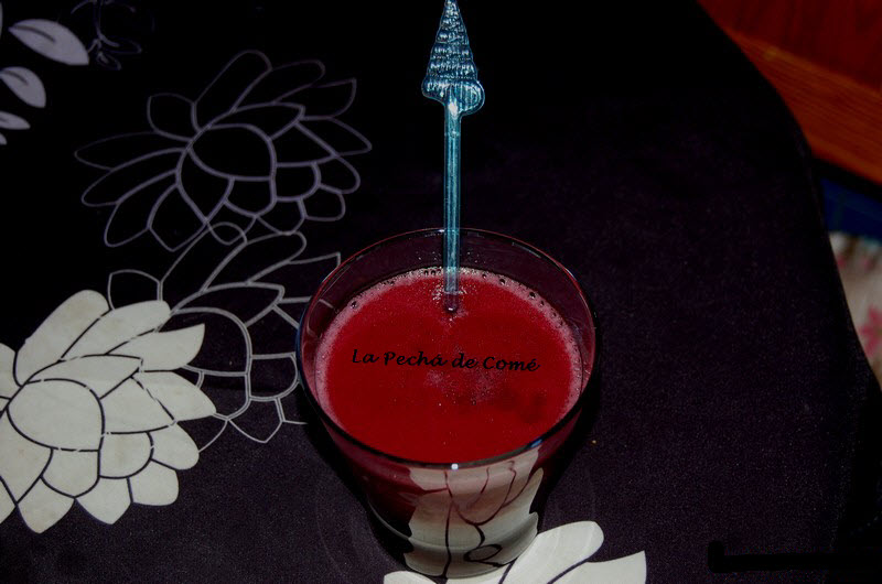 - Una vez frío, añadimos un poco de reducción de vino tinto, el zumo del limón y de la naranja. Removemos a velocidad 2 durante unos segundos.