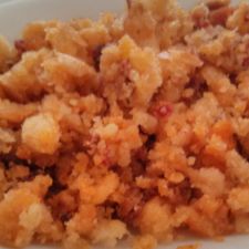 - Volcamos las migas en una sartén y vamos removiendo para que queden tostaditas y crujientes. Cuando veamos que están tostaditas, las echamos en un recipiente y reservamos.