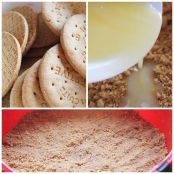Trituramos las galletas y mezclamos con la mantequilla fundida. Con esto forramos la base de un molde, mejor desmontable pero si no lo tenéis podéis poner papel film que sobresalga por los laterales, ya que así podremos tirar del papel y desmoldar la tarta sin ningún problema. Guardamos el molde con la base de las galletas en el frigorífico una media hora.