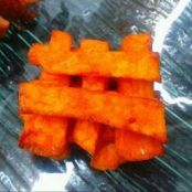 - Pelamos y cortamos el boniato en bastones cortos. Los freímos en aceite bien caliente, removiendo constantemente, hasta que queden crujientes. Se hacen antes que las patatas, pero para que la capa exterior quede crujiente, hay que freírlos un rato.