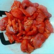 Cortamos la carne en tiras y la embadurnamos con el tandoori masala. Le agregamos la cebolleta en trozos y la copa de cava. Dejamos un par de horas en la nevera.
