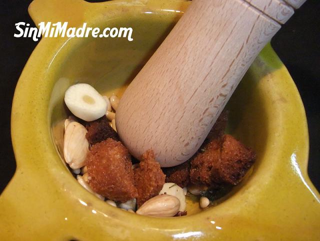 Es piquen tots els ingredients de la picada en un morter.