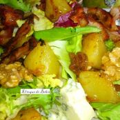 Mientras, en una ensaladera, se van poniendo la hojas de lechuga, berros, canónigos o una mezcla de todo, se pone queso azul en trocitos, el bacon , las nueces, las uvas pasas o las ciruelas pasas se reserva