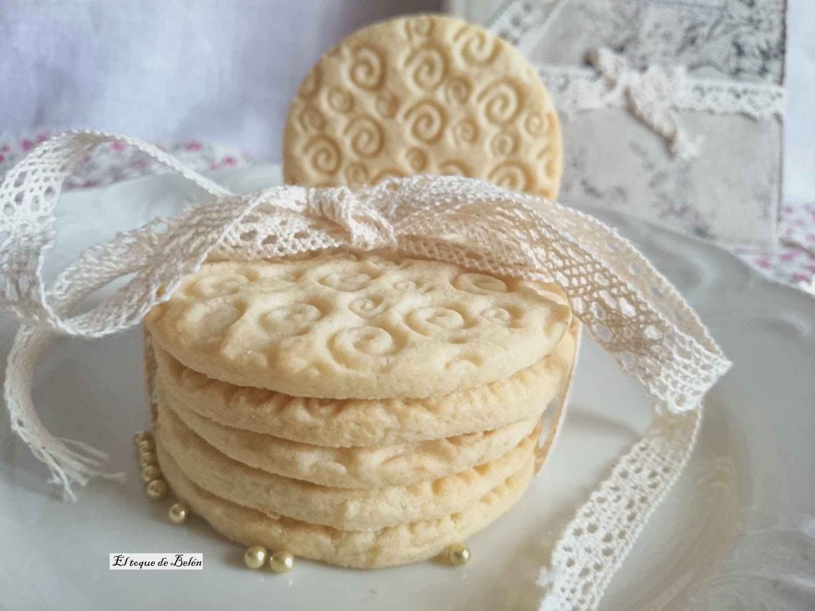 Se estira la masa entre dos papeles de horno y en mi caso solo tenia un rodillo texturizado que fue lo que use lo pase y corte las galletas en mi caso también fueron redondas , con la masa que sobro hice la misma operación del papel de horno, en este caso no le pase el rodillo, las corte con un cortador en forma de flor y con un poquito de masa que separe le añadí cacao y con un cortador pequeñito hice unas flores las pegue en la masa. y a mi me han encantado.
