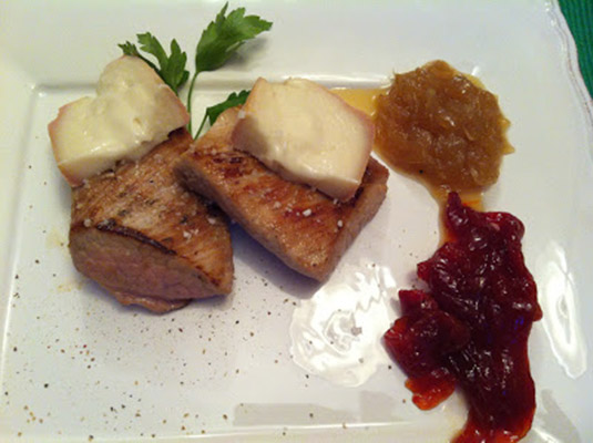 Se acompaña con la cebolla caramelizada y con pimientos rojos asados o bien con cebolla caramelizada