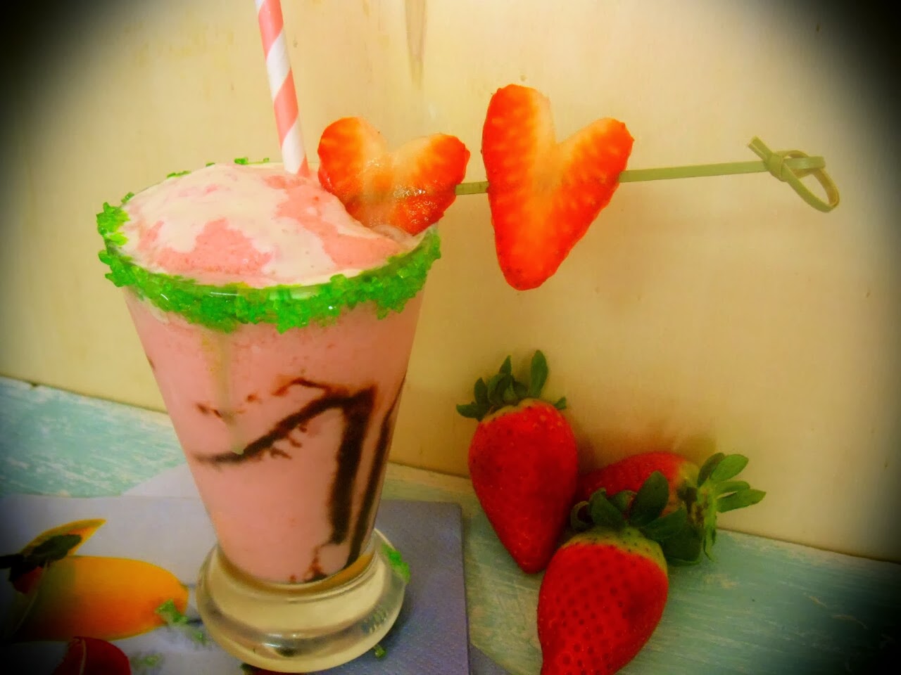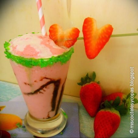 ( esta versión de este coctel yo he congelado la copa con un poco de sirope de chocolate por dentro y decorado el borde de la copa con azúcar de color verde.)