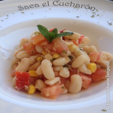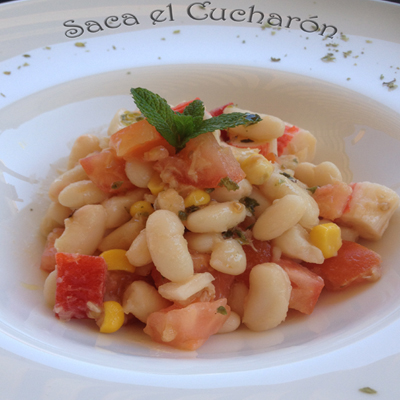 En una fuente o ensaladera mezclamos todo esto con las judías, el maíz y el atún.
