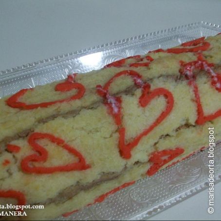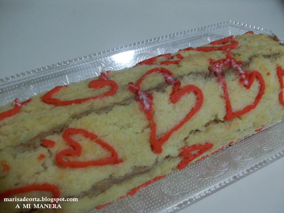 (Como podéis ver, el mío se rompió entero, única culpable yo, con las prisas y haciendo "veinte cosas" al mismo tiempo, primero, lo hice en una bandeja más grande que Ángela, por lo que me quedó bastante mas fino, segundo, con las prisas no me dí cuenta y lo enrollé al revés...sí, habéis leído bien, en lugar de dejar los corazones por fuera, los enrolle hacia dentro, y me dí cuenta al quitarle el trapo y los papeles para rellenarlo...., en fín, la próxima vez, que repito seguro porque está de vicio, prestaré más atención)