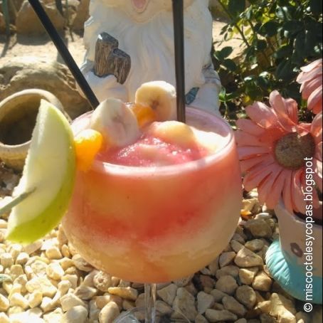 Ponemos las mandarinas dejando unos gajos para decorar ponemos el platano la manzana el azucar y lo batimos un poco solo un poquito intrducimos el gin.el tequila hielo 1/2 bote de lima limon.y batimos todo hasta que quede granizado decorar copa al gusto y para terminar un chorrito de sirope de fresa. pero cuando ya este en la copa para que lentamente valla cayendo....