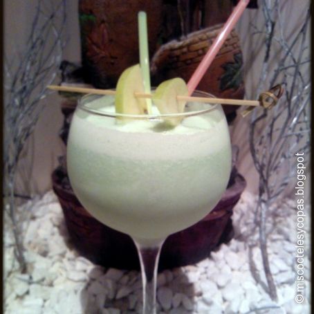 Troceamos la manzana dejando dos rodajas para decorar, metemos los demas ingredientes menos el sirope de menta en la batidora y batimos abrimos y añadimos un poquito del sirope de menta para darle el tono de color y removemos otra vez y listo vertemos en la copa de balón y decoramos con la manzana .