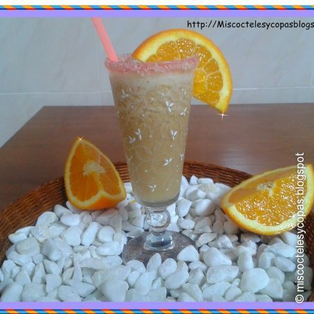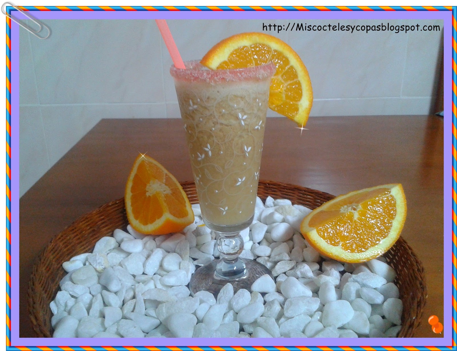 Introducir todos los ingredientes en la batidora y batir hasta que quede una mezcla homogenea y espumosa verter en una copa decorando el borde y listo .