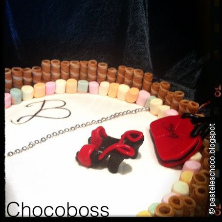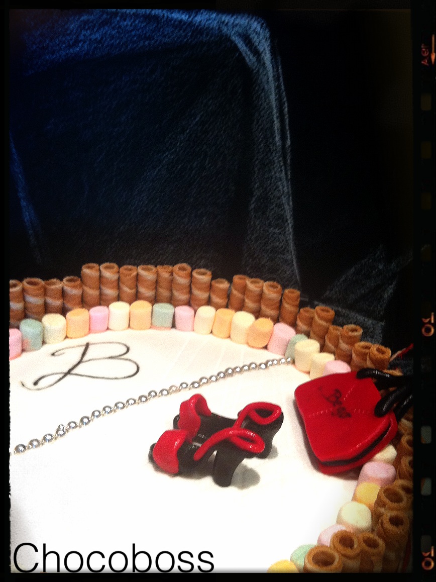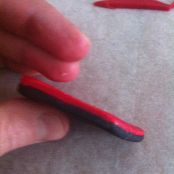 Mientras se hornea el bizcocho,he buscado plantillas en internet y las dibujé en papel de horno con rotulador de repostería,recorte las formas,y ya tenemos las plantillas.Para hacer el bolso he hecho tres bolitas de fondant una negra,y las otras dos rojas,las he aplastado,y he hecho un sandwich,quedando el color negro atrapado entre las bases rojas,le he dado forma,y le he puesto asas.cuando ya estén terminados,los barnizamos,y en este paso tenemos dos opciones.