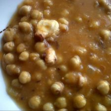 Hacer un Sofrito con la patata, el aceite y la hoja de laurel, luego añadimos el resto y lo ponemos a hervir dejando que se cueza a fuego lento durante3-4 horas