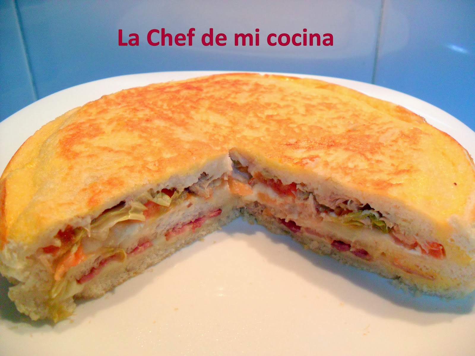 Untamos la cubeta de mantequilla yo la unto con un papel de cocina, ponemos una capa de pan de molde y encima el bacon ó jamon york y el queso. Ahora ponemos otra capa de pan de molde y untamos con un poco de mayonesa y encima le añadimos tomate cortado a rodajas, lechuga cortadita pequeñita y la lata de atún. Ponemos otra capa de pan de molde y lo untamos con mantequilla. Batimos los huevos y le añadimos una pizca de sal y los ponemos por encima repartiéndolo bien por todo el sandwichón.