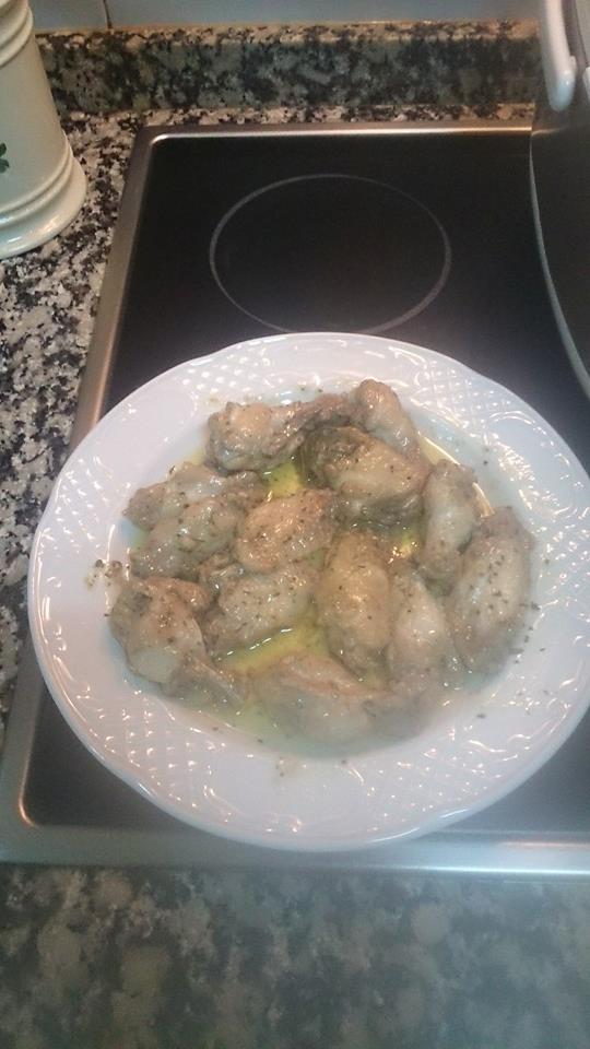 Cortamos el ajo muy fino y lo doramos un poco no dorado del todo. Salpimentamos las alitas de pollo mientras se hace el ajo. Cuando el ajo este dorado lo retiramos. Doramos las alitas de pollo. Mientras que se doran las alitas machacamos el ajo en un mortero. Después de dorar las alitas añadimos el ajo machacado con un poco de agua echada en el mortero así se echa mejor el ajo. Cuando esté bien caliente añadir el vino y dejar un tiempo para evaporar el alcohol después cubrir de agua y añadir una pizca de sal y perejil. Sin cerrar la tapa dejar que se haga hasta que se evapore el agua y listo.