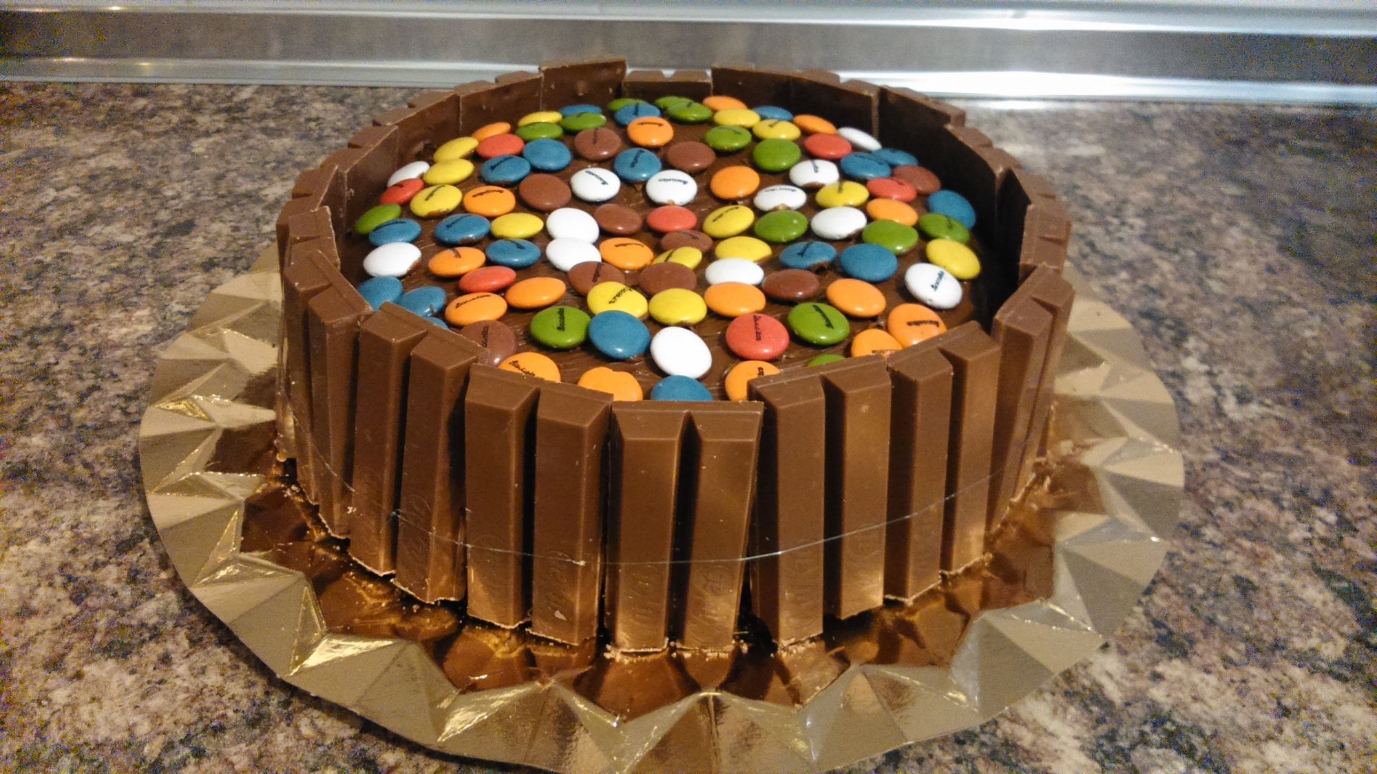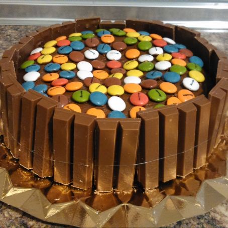 Cuando este frió untar con nocilla, poner todo el borde de kit-kat y decorar con lacasitos.