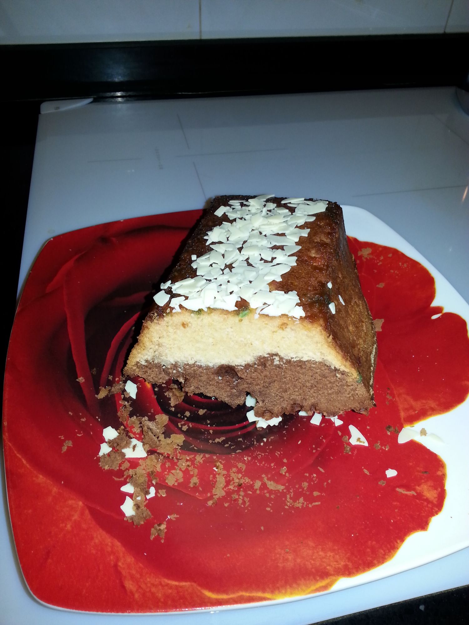Engrasar el molde con la mantequilla y verter la mitad de la masa; a la otra mitad le añadimos 5 cucharadas de cacao (o pepitas de chocolate) y lo vertemos en el molde.