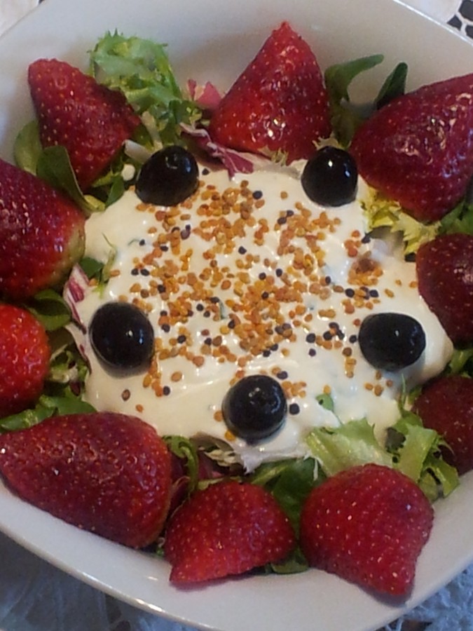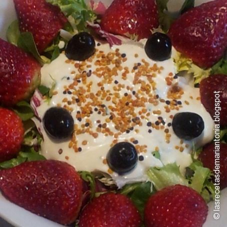 Decoramos la ensalada, como más nos guste, le añadimos la salsa de yogurt, junto con el polen y por último las aceitunas, removemos muy bien para que se mezclen todos los ingredientes y lista para comer.