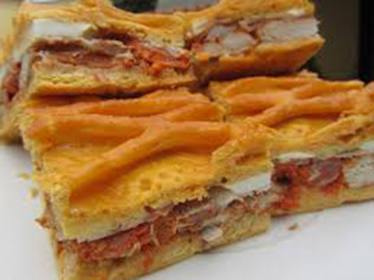 7º Colocar en la bandeja del horno la mitad mayor,añadir el relleno por capas de materiales, taparlo con la otra y cerrarlo.