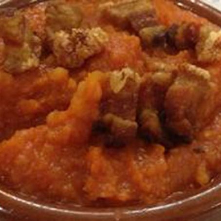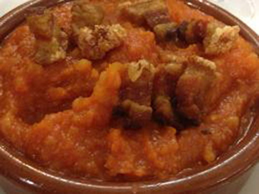 Servir en cazuela de barro y encima de las patatas colocar los tocinillos