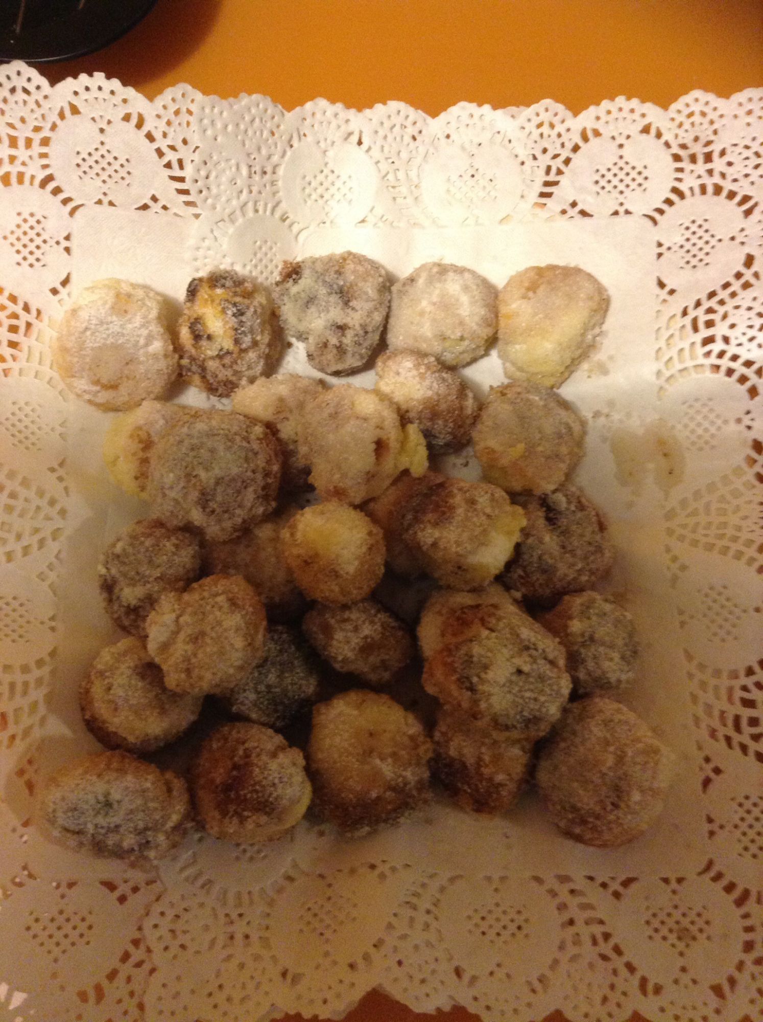 Se forman piezas redondas en forma de bollo de tamaño pequeño y se fríen en abundante aceite caliente. Se colocan en papel absorbente y se pasan a la bandeja espolvoreando con azúcar glas.