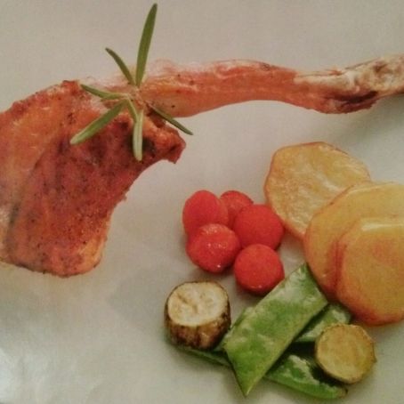 Dispón las piernas de conejo en una fuente y píntalas con el aceite que ha sobrado de dorarlas. Hornea 20 minutos.